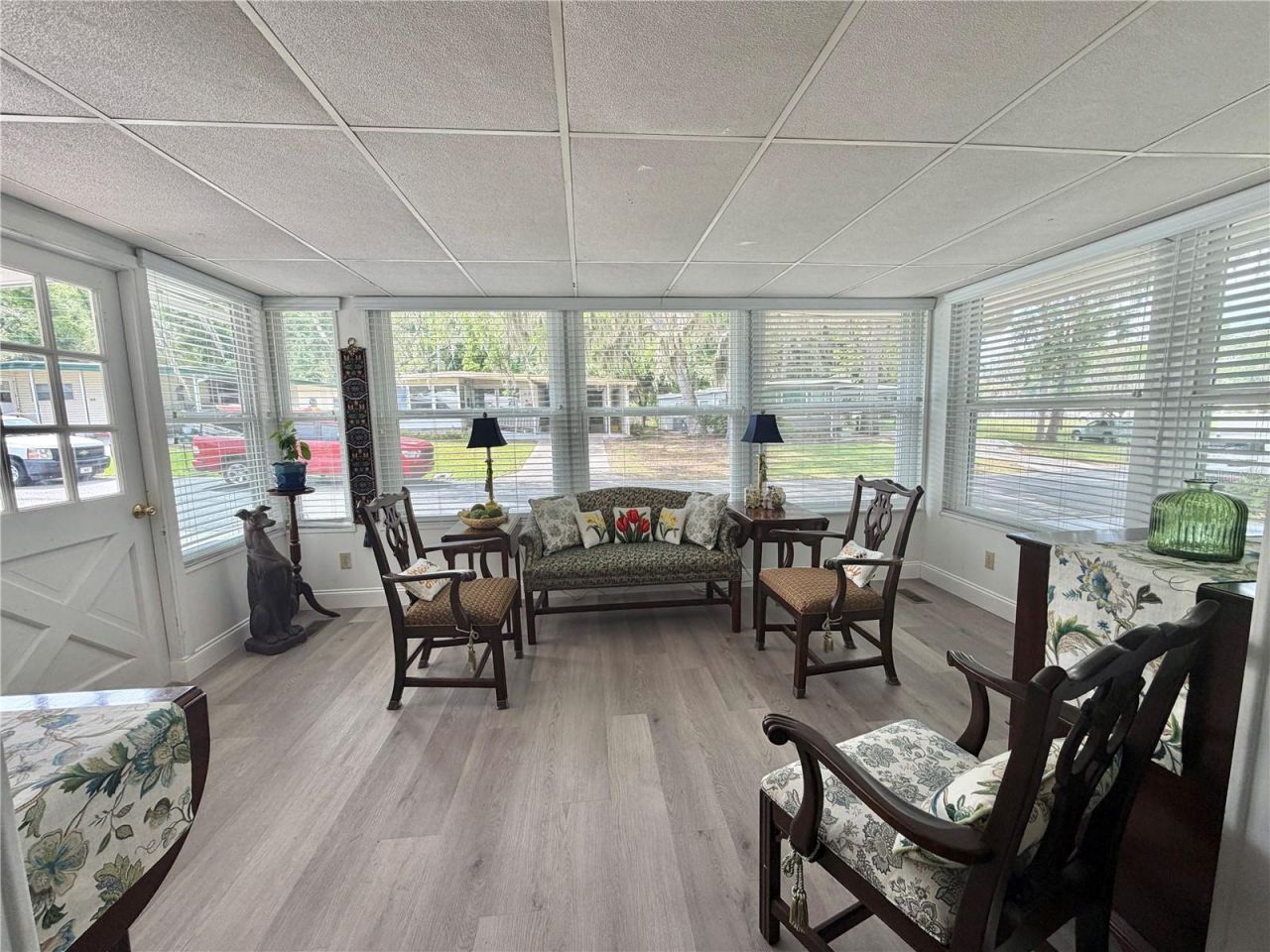 Welcome to 103 Royal Palm Drive. A warm, welcoming retreat where comfort meets thoughtful design and every detail has been carefully considered. Offering 1,312 square feet of beautifully updated living space, this charming 2-bedroom, 2-bath home invites you to slow down, settle in, and truly enjoy where you live. A beautiful paver driveway (2024) creates excellent curb appeal from the moment you arrive and continues seamlessly along the side yard to the back porch, providing both style and functionality. The home's exterior vinyl siding adds to its attractive appearance while providing durability and low-maintenance living. Just beyond, a welcoming Florida room entry sets the tone, an inviting space filled with natural light that's perfect for greeting guests, enjoying your morning coffee, or simply easing into the day. From there, step inside and feel the difference. The solid, upgraded subfloors and stylish luxury vinyl plank flooring (2022) create a sense of quality underfoot, while natural light pours through brand-new windows (2023), giving the home a bright and airy feel. Updated lighting with dimmers (2023) allows you to set just the right mood. At the heart of the home, the kitchen is designed to bring friends and family together. Featuring rich solid wood cabinetry with convenient pull-out shelves, stainless steel appliances (Refrigerator 2025), sleek Corian countertops, it's a space that's as functional as it is inviting, perfect for everything from morning coffee to holiday gatherings. Thoughtfully placed pendant light fixtures hang above the peninsula and over the sink, adding both style and warm, focused lighting to the space. The spacious primary suite offers a peaceful escape, complete with a custom-built walk-in closet and a beautifully updated en-suite bathroom featuring a walk-in shower for comfort and ease. The guest bathroom includes a tub, thoughtfully designed to accommodate both relaxation and accessibility. (Both bathrooms are ADA compliant.) Step outside and discover even more to love. The large, screened porch is perfect for morning breezes or evening conversations and beyond it, a private wooded backyard offers a serene, natural setting with added privacy, making it the perfect place to unwind. With major updates already completed, including a membrane roof (2023) with new trim (2023), HVAC system (2019), and tankless water heater (2016), this home offers not just beauty, but peace of mind.................Hawthorne at Leesburg is an active, resident owned, 55+ cooperative, waterfront, gated community, with beautifully landscaped grounds, lakes with illuminated fountains and a relaxing and comfortable gazebo. The affordable monthly maintenance fee of $397 includes water, sewer, lawn mowing, private emergency services and storage space for recreational vehicles, boats, trailers and much more! The beautiful clubhouse is complete with a full-time program coordinator, more than 100 different activities and seating for 550. It has a hospitality lounge, card rooms, craft rooms, billiard room, fitness center, library, fine arts room and many more. There is excellent fishing, outdoor geo-thermally heated pool and two enclosed therapeutic pools. Hawthorne boasts a private marina monitored by an electronic security system with over 120 boat slips and access to the Harris Chain of Lakes and beyond.
