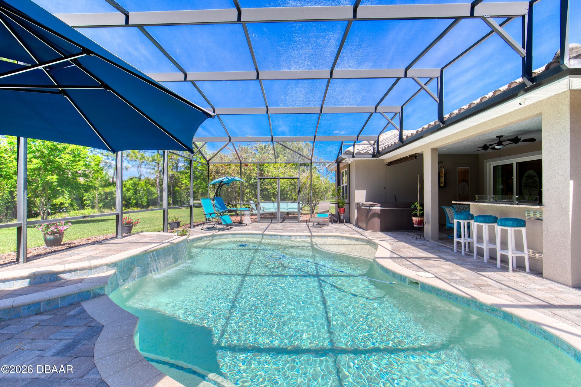 Built in 2018 and located in the sought-after Hunters Ridge community, this Parade of Homes Award Winner (2020) offers a well-designed layout, quality finishes, and thoughtfully updated indoor and outdoor living spaces.This home features 3 bedrooms plus a large office or potential for 4th bedroom, with over 2,622 square feet of living space, situated on a lot just over a quarter acre. The open floor plan is complemented by a split bedroom layout, providing both functionality and privacy.The primary suite is generously sized, offering additional space ideal for a sitting area, reading nook, or private workspace. The primary bathroom includes a dual vanity, walk-in shower, and private water closet. The home also features a well-designed laundry room with built-in cabinetry, counter space, and a utility sink that can double as a great coffee bar. The main living area flows seamlessly to the outdoor space through sliding glass doors, enhanced by a remote-controlled shade, and opens to a screened-in lanai with updated screens. The backyard is designed for both everyday use and entertaining, featuring a pool with fountain, brick paver decking, and a fully equipped outdoor summer kitchen with sink and grill. A paver walkway, new landscaping, and two recently planted trees further enhance the outdoor setting, along with a fenced yard (approximately two years old) for added privacy. The home is also equipped with an audio system that runs speakers both inside and out, adding to the functionality of the living and entertaining spaces.Additional improvements include new rain gutters, updated dining room and entryway light fixtures, and a solar system with battery backup, adding efficiency and functionality to the home.With its combination of space, layout, upgrades, and location within one of Ormond Beach's most established communities, don't miss the opportunity to own this well-appointed home in the highly sought-after Hunters Ridge community.