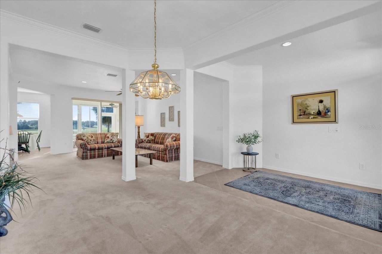 Welcome to your dream home on the golf course. This stunning Kingston Model in Hampton Hills boasts over 2,400 square feet of luxury living. As you approach, you'll be struck by the professionally landscaped yard and double lead glass doors. Inside and prepare to be wowed by the gorgeous views of the golf course from every angle. The spacious foyer leads into a formal dining room and living room, ideal for hosting dinner parties or enjoying quiet evenings with family. But it's when you step onto the enclosed lanai that you'll be captivated. The tile flooring, large sliding windows and backyard access make this space ideal for entertaining or simply relaxing while taking in the breathtaking panoramic view. On its own side of the house, the primary suite is a retreat with oversized windows showcasing those same incredible views. You'll love getting ready in your spa-quality en suite featuring a garden tub and shower. And don't forget about that huge walk-in closet. The heart of this home is undoubtedly the expansive kitchen with Corian countertops, stainless steel appliances, glass backsplash, ample cabinets and pantry. Imagine cooking up delicious meals while admiring your surroundings through those big picture windows. Talk about inspiration! The breakfast nook and large family room are also positioned to enjoy those amazing golf course views. But let's not forget about guests, they'll feel right at home in their oversized second bedroom with its golf course view or in the spacious third bedroom complete with a big closet. The second bath conveniently features plenty of counter space plus a linen closet for extra storage. And finally, practicality meets convenience with an oversized laundry room that can easily double as a butler's pantry because who doesn't want more cabinet space? Plus, an expanded two-car plus golf cart garage means there's plenty of storage for all your needs. Don't miss out on this incredible opportunity to live on one of our area's most beautiful golf courses. Schedule your showing today and see why this home is must-see.