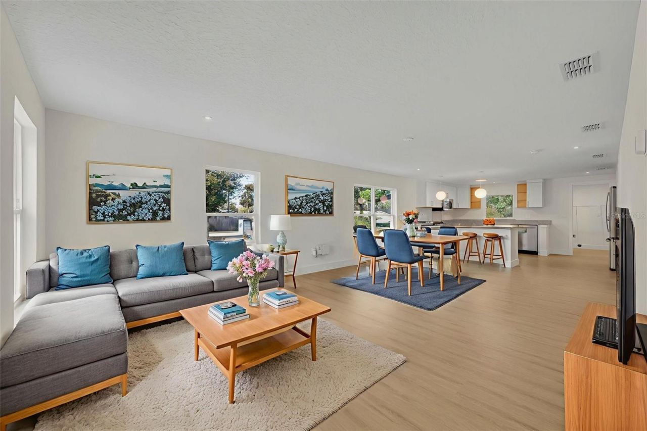 One or more photo(s) has been virtually staged. Welcome to this beautifully reimagined home, thoughtfully renovated from the studs up to display modern comfort, efficiency, and peace of mind. Step inside to a light and bright interior featuring open-concept living, brand-new flooring throughout, and a seamless flow ideal for both everyday living and entertaining.This home has undergone a complete transformation, including full interior and exterior demolition to the studs, reconstructed framing, a new leveled subfloor with Gyp-Crete, and all new systems-plumbing, electrical, HVAC, insulation, and lighting-completed to current Florida code standards. A new architectural shingle roof (2025), new soffit and fascia, exterior sheathing, vapor barrier, lap siding, gutters, and downspouts provide long-term durability and curb appeal.The brand-new kitchen and bathrooms feature modern finishes and new GE appliances, creating a fresh, functional space you'll love. Updated windows and doors enhance energy efficiency while filling the home with natural light.Enjoy outdoor living with a covered front patio, new concrete front porch, rear entry step and landing, and a partially fenced-in backyard-perfect for relaxing, pets, or entertaining. Additional upgrades include a new driveway concrete apron and thoughtfully designed exterior improvements that complete this move-in-ready package.With every major component replaced or updated, this home offers the rare opportunity to enjoy new-construction quality with timeless charm-all in a clean, modern setting ready for its next owner.