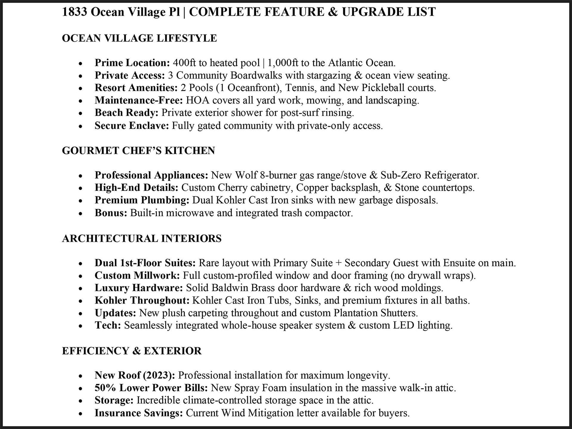 Experience Luxury Coastal Living in Ocean Village Discover this masterfully maintained residence by Harry Trevett Custom Homes in the prestigious gates of Ocean Village?Amelia Islands premier community (#2 Best Island in the U.S. - Travel + Leisure). THE LIFESTYLE: Just 400ft to the heated pool and 1,000ft to the Atlantic. Enjoy 3 private boardwalks with stargazing benches, 2 pools (1 oceanfront), and new pickleball/tennis courts. The HOA handles all landscaping/exterior maintenance for true lock-and-leave living. CHEFS KITCHEN: New Wolf 8-burner gas range, Sub-Zero fridge, custom Cherry cabinetry, Copper backsplash, and dual Kohler cast iron sinks. The open floor plan and soaring ceilings create a bright, airy flow perfect for entertaining. INTERIOR EXCELLENCE: Rare dual first-floor suites (Primary + Guest with ensuite). Architectural details include full custom window/door framing (no drywall wraps), rich wood moldings, Baldwin Brass hardware and Plantation Shutters. Features Kohler cast iron tubs/sinks and premium fixtures throughout, new plush carpets, and a whole-house speaker system. EFFICIENCY & UPGRADES: New Roof (2023). Massive walk-in attic with new spray foam insulation, reducing power bills by 50% while providing incredible climate-controlled storage. Private exterior shower for post-beach convenience. Meticulously updated legacy home of 27 years. PLEASE SEE ATTACHED PHOTOS FOR THE FULL COMPREHENSIVE LIST OF CUSTOM FEATURES & RECENT UPGRADES!