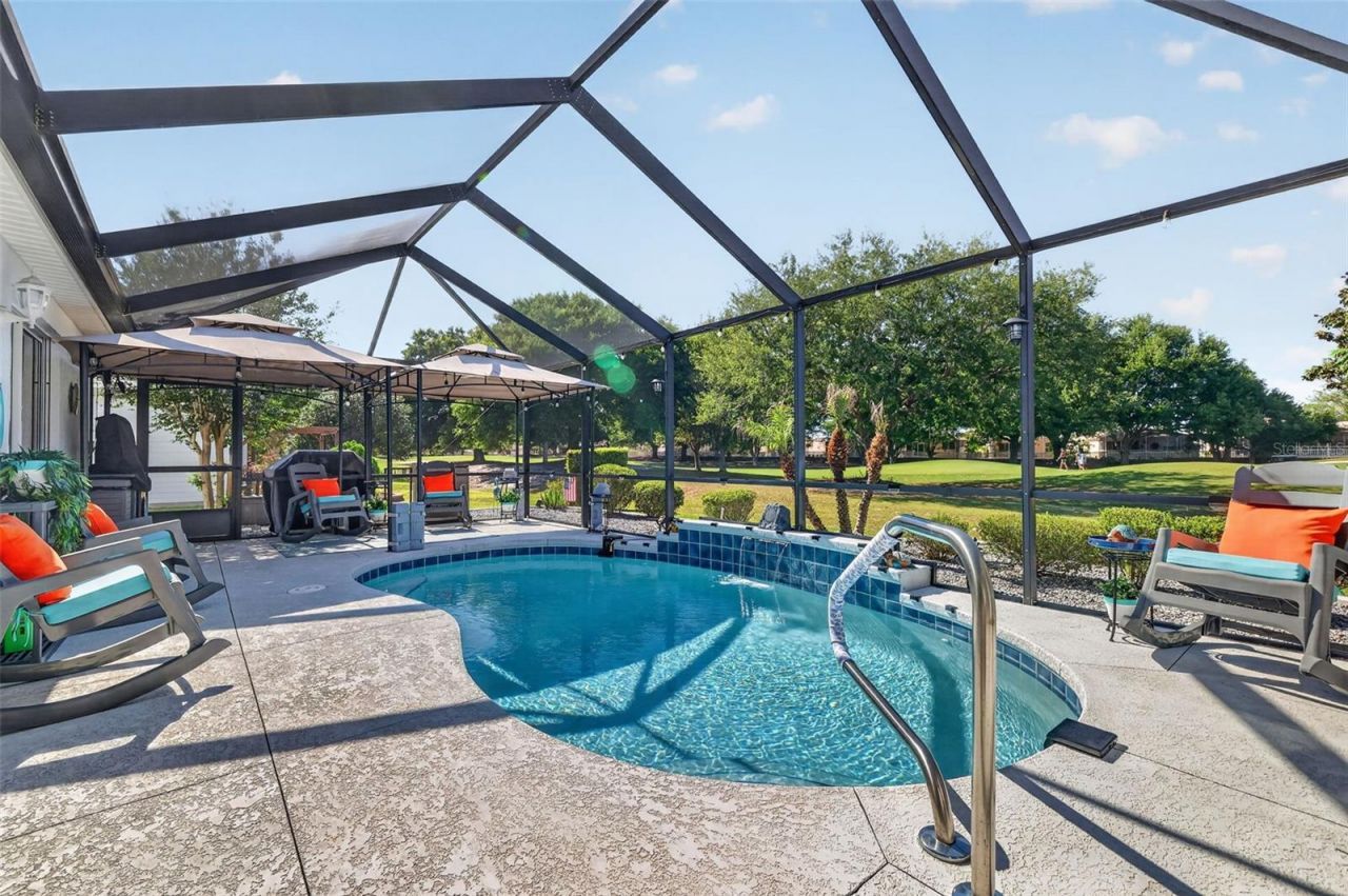 OVERLOOK MAGNIFICENT GOLF FRONT VIEWS in this EXQUISITE 3/3 DESIGNER LANTANA with SWIMMING POOL and SPACIOUS FLORIDA ROOM - PERFECTLY SITUATED on the 5th hole of the Tierra Del Sol Championship Golf Course in the highly desirable Village of Palo Alto! ROOF 2020. Only a short golf car ride to BOTH Spanish Springs Town Square and Lake Sumter Landing with shopping, dining, and live nightly entertainment! BOND PAID! Welcoming you to this AMAZING home are ENHANCED TIERED hardscaping with STONED beds, PAINTED driveway, and PAVER front patio-ideal for RELAXING or ENJOYING fun-filled OUTDOOR ENTERTAINING with friends! Step through a DOUBLE side lit entry into the BRIGHT, GENEROUS foyer. The OPEN CONCEPT layout of the main living areas boast ELEGANT UPSCALE FINISHES including HIGH ceilings adorned with CROWN MOLDING, CUSTOM window and door CORNICES, and LUXURY VINYL PLANK and TILE flooring throughout - no carpet! The GOURMET kitchen showcases EBONY and ALABASTER cabinetry with PULLOUTS, GRANITE countertops, STAINLESS appliances, UNDER and OVER-cabinet lighting, PANTRY closet, and an EAT-IN breakfast bar. The adjoining dinette opens through elegant French doors into a STUNNING FLORIDA ROOM! This BRIGHT and SPACIOUS 210-square-foot addition showcases TILE flooring and WALLS of WINDOWS, beautifully accented by a continuous custom CORNICE, all framing SWEEPING GOLF COURSE VIEWS! Sliding glass doors from both the living room and Florida room open effortlessly to an impressive screened birdcage featuring TWO canopy-covered pergolas and a SOLAR AND ELECTRIC HEATED SWIMMING POOL with a waterfall-perfectly blending indoor and outdoor living. This EXCEPTIONAL OUTDOOR RETREAT invites you to enjoy a refreshing swim or unwind on the expansive deck while taking in BREATHTAKING GOLF FRONT VIEWS! Retreat indoors to the luxurious primary bedroom featuring VAULTED ceilings with CROWN MOLDING, a GENEROUS WALK-IN closet, and sliding glass doors to the pool. Its en-suite bathroom boasts TILE flooring, EBONY cabinetry, GRANITE countertops, DUAL VESSEL sinks, TILED WALK-IN shower, and corner GARDEN tub. Two additional bedrooms and a second bathroom are conveniently located near the front of the home ensuring plenty of PRIVACY for guests or home office. Both bedrooms feature LVP flooring and built-in closets, while bedroom two showcases a BAY WINDOW. The second bathroom offers TILED floors, EBONY vanity with GRANITE countertop and VESSEL sink, tub and shower combination, and a hallway LINEN closet. A generous INTERIOR laundry room features TILE floors, WHITE cabinetry, and a CONVENIENT HALF BATHROOM! Completing the package is a two-car garage boasting a PAINTED floor, WHITE cabinets, pull-down stairs with attic access, and PLENTY of room for parking and storage! DON'T MISS YOUR OPPORTUNITY TO OWN THIS SPECTACULAR POOL HOME! The Village of Palo Alto is IDEALLY LOCATED - close to BOTH Spanish Springs Town Square and Lake Sumter Landing; near three large Regional Recreation Centers: Laurel Manor, Savannah Center, and La Hacienda; several Country Clubs and Championship Golf Courses: Tierra Del Sol, Hacienda Hills, Orange Blossom Hills; and multiple pools, golf, and pickle ball! ONLY MINUTES to County Road 466 and US 441 with an abundance of shopping, dining, banking, medical, and more! PLEASE WATCH OUR WALKTHROUGH VIDEO of this EXCEPTIONAL GOLF FRONT POOL HOME in a FANTASTIC LOCATION and CALL TODAY to schedule your Private Showing or Virtual Tour!