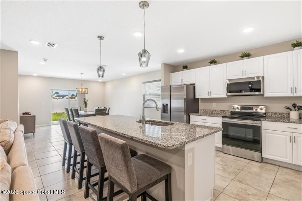 Nearly New and Ready To Go! Built in 2021, this concrete block home offers a flexible layout and easy living throughout. Open floor plan with a standout kitchen--granite counters, oversized breakfast bar with seating for 4+, stainless steel appliances, a pantry, updated hardware, and lighting. Tile floors throughout, split-bedroom layout for privacy, and a spacious primary suite with double sinks, tiled shower, a walk-in closet, and a private commode. Sliders lead to a patio and a fully fenced backyard. Smart home features, solar panels paid off at closing, shutters for the whole house, and a roomy garage with overhead storage. Furnishings negotiable too! Room sizes are approximate and subject to error.