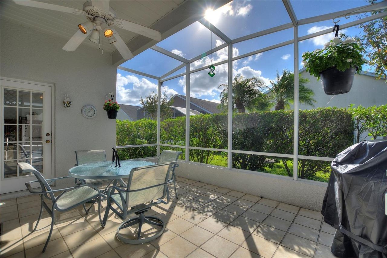 RidgeMont 2 bedroom / 2 Bath / Den model on 1-floor in Gated Community with newer HVAC and water heater PLUS a 200+ SF South-Facing screened lanai, located just 0.4 miles from High Vista's private clubhouse and outdoor amenity center. Charming portico entry with overhead sunburst window and full-view screen door enters the great room with cathedral ceiling and a wall of patio windows to the lanai. Eat-in kitchen in front of house has Corian countertops, tile-on-point backsplash, crown-molded cabinets, white appliances and large closet pantry. Installed storage cabinets over washer/dryer in corridor laundry. Primary en suite bedroom has french door access to lanai with retractable screen door, 13x6 walk-in-closet, dual sink vanity, soaking tub, linen closet and shower. Guest bedroom and den share a full bath and large linen closet in this split bedroom floor plan. 2-car garage has insulated garage door with keypad entry, utility sink, installed cabinets, workbench, ceiling fan and pull-down ladder access to attic. Freezer & refrigerator in garage and RING doorbell are not included. New water heater installed 2024; new A/C air handler installed 10/2023; exterior painted 2022; HVAC replaced 2018; newer smoke detectors. Sold As-Is. Ridgewood Lakes is a golf cart friendly community. $230 monthly High Vista HOA fee includes Spectrum internet and basic cable TV with 2 cable boxes, lawn mowing and exclusive access to resident-owned 12,000 SF private clubhouse and amenities. $425 semi-annual Ridgewood Lakes HOA fee provides 24x7 staffed security gate and master association-owned private road maintenance. Adjacent to 18-hole White Heron Golf Club with restaurant, privately owned and open to the public. High Vista is a 55+ community with outdoor heated pool and spa, fitness center, library, pub & many organized activities. Pickle ball, tennis, bocce and shuffleboard courts. Miles of biking and walking trails within Ridgewood Lakes gated community. Shopping, Disney, Universal, Orlando & Central FL entertainment nearby, easy access to I-4, medical facilities, airports & Sunrail Station. Advent Health hospital is 3 miles away.