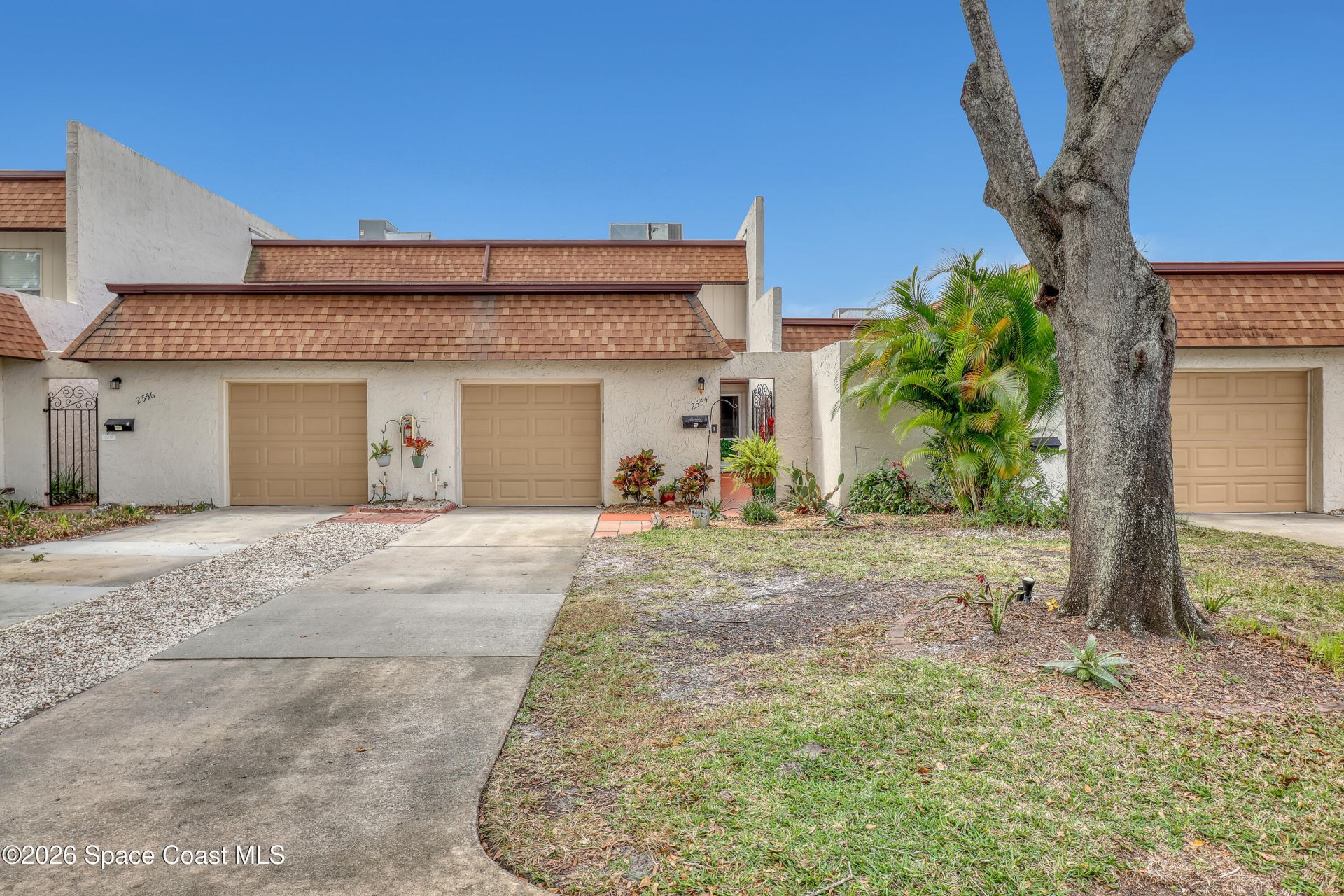 Beautifully updated and spacious 3-bedroom, 3-bath condo with a garage! For peace of mind, this is a concrete-block property. This stunning two-story residence offers the perfect blend of comfort, style, and convenience. Featuring three generously sized bedrooms and three full bathrooms, the home also includes an attached one-car garage and a private courtyard -- ideal for secure parking and additional storage. The Landry room is under air, and there is no carpet! The open living area is filled with natural light and features sliders leading to a bright Florida room, perfect for relaxing or entertaining. The first floor includes a bedroom with an ensuite bath, ideal for guests or multigenerational living. Upstairs, the primary suite offers a private sunroom for added living space. A convenient laundry area and ample storage throughout complete the home. Ideally located near banks, shopping, NASA, beaches, and Orlando attractions, this move-in-ready condo offers exceptional value.
