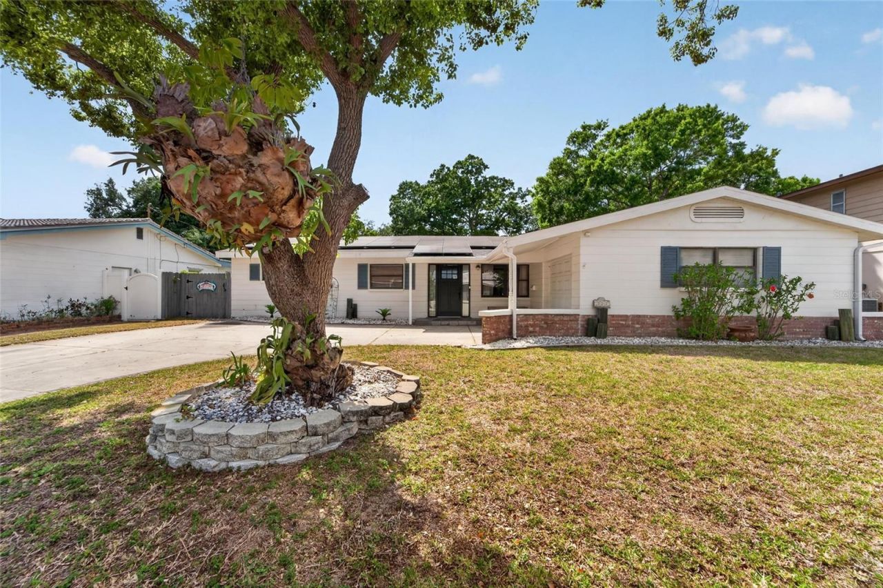 Welcome to this beautifully updated ranch-style home nestled on a generous 0.22-acre lot in the sought-after Sheryl Manor neighborhood of St. Petersburg - one of Pinellas County's most centrally located and established residential communities. Offering seamless access to the Gulf beaches, vibrant Downtown St. Pete, Northwest Park, and the Tyrone Mall shopping corridor, this home places everything the Tampa Bay lifestyle has to offer within easy reach. At the heart of this home is a showstopping, fully remodeled gourmet kitchen that rivals those found in luxury new construction. Featuring custom gray shaker cabinetry floor-to-ceiling, quartz waterfall countertops, a large center island with seating, professional stainless steel appliances including a double wall oven and French door refrigerator, a designer range hood, subway tile backsplash, and pendant lighting - this kitchen is a true culinary centerpiece designed for entertaining and everyday living alike. The open-concept floor plan flows effortlessly from the kitchen into a spacious dining area and a bright, oversized living room with whitewashed brick accents, track lighting, and French doors that open to the covered backyard patio - creating an indoor-outdoor connection perfect for Florida living. A dedicated private office or den with garden views and its own French door entry is ideal for remote work or a quiet retreat. The primary suite features a fully renovated en-suite bathroom with designer tilework, a frameless glass walk-in shower, navy blue vanity with gold accents, and black matte fixtures - a spa-like escape. Additional bedrooms are generously sized with ample closet storage, and ceramic tile flooring flows throughout the entire home for easy care and a clean, consistent look. Major capital improvements are already complete and paid for: a brand new roof installed in 2024 and a fully paid-off solar energy system dramatically reduce ownership costs and provide long-term value from day one. The expansive, fully fenced backyard offers plenty of room to add a custom pool, outdoor kitchen, or play area - a blank canvas ready for your vision. A covered rear patio and wide concrete driveway with covered carport complete the picture.This is a rare opportunity to own a move-in ready, solar-powered home with a gourmet kitchen renovation, new roof, flexible floor plan, and pool-sized lot in one of St. Pete's most convenient and desirable neighborhoods.