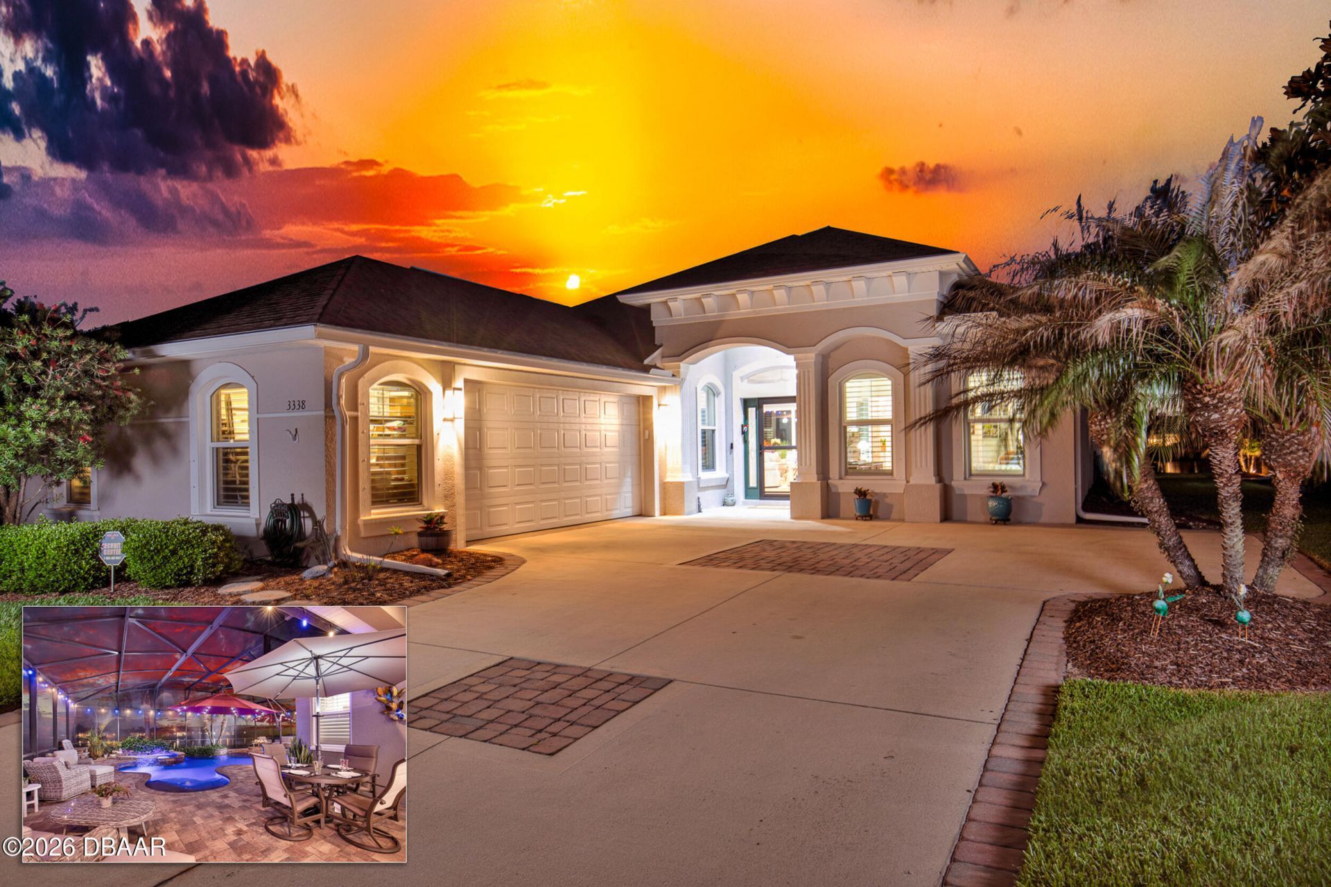 Luxury Lakefront Living at Lakes of Verano in Venetian Bay - Upgraded Martello Model with Resort-Style Pool & Sunset Views. Welcome to 3338 Bellino Blvd, an exceptional Paytas-built home in the sought-after Lakes of Verano community, where thoughtful upgrades, elegant finishes, and resort-style outdoor living come together in one beautifully maintained residence. This stunning home offers an ideal open-concept layout with luxury vinyl plank flooring throughout the main living areas, upgraded carpeting in all bedrooms, crown molding, designer lighting, and abundant natural light. The spacious living room is enhanced by custom built-in cabinetry and a wine bar with wine refrigerator, creating the perfect setting for entertaining or relaxing in style. The kitchen is both functional and refined, featuring upgraded LED under-cabinet lighting, exterior-vented exhaust, and seamless flow into the main living and dining spaces. The dedicated office/flex space includes custom built-in shelving, cabinetry, drawers, added sconces, and a ceiling fan--perfect for working from home. The luxurious primary suite offers a private retreat with a custom walk-in closet system, separate door to patio and a beautifully upgraded bath featuring a new shower stall floor and built-in bench. Guest bedrooms are equally well appointed with mirrored sliding closet doors, custom built-ins, and thoughtful storage enhancements. The guest bath has been upgraded with dual grab bars for added comfort and accessibility. When you step outside, you are in your private, screened lanai where you will experience true Florida resort living. The heated saltwater pool and spa feature a waterfall, hot tub, upgraded lighting and dual heating systems--including an electric heat pump and propane heater. The pool enclosure has been upgraded with premium 20/20 no-see-um mesh for year-round comfort. The outdoor space is designed for both beauty and convenience, with lush landscaping, irrigation with drip and soaker systems, fenced dog run, and breathtaking sunset and lake views. A built-in Blaze grill, fire pit, and expansive patio create the perfect backdrop for entertaining. Additional upgrades include: Epoxy-coated garage floor; Extra attic insulation above garage; 220V outlet for electric vehicle charging; Whole-house surge protector; Whole-house water filtration system; UV light in HVAC system; Smart doorbell and smart lighting; Storm/screen front entry door; 250-gallon underground propane tank with monitor; Whole-house security system; Built-in laundry shelving Accent dining room lighting. Located in one of Venetian Bay's most desirable communities, this home offers a rare combination of luxury, comfort, and lifestyle--just minutes from golf, dining, shopping, and New Smyrna Beach. This is more than a home--it's a beautifully upgraded Florida lifestyle. There are no warranties expressed or implied. All measurements are approximate. Sq. footage received from the tax rolls. All information recorded in the MLS is intended to be accurate but can not be guaranteed. Buyer should check HOA for rental restriction.