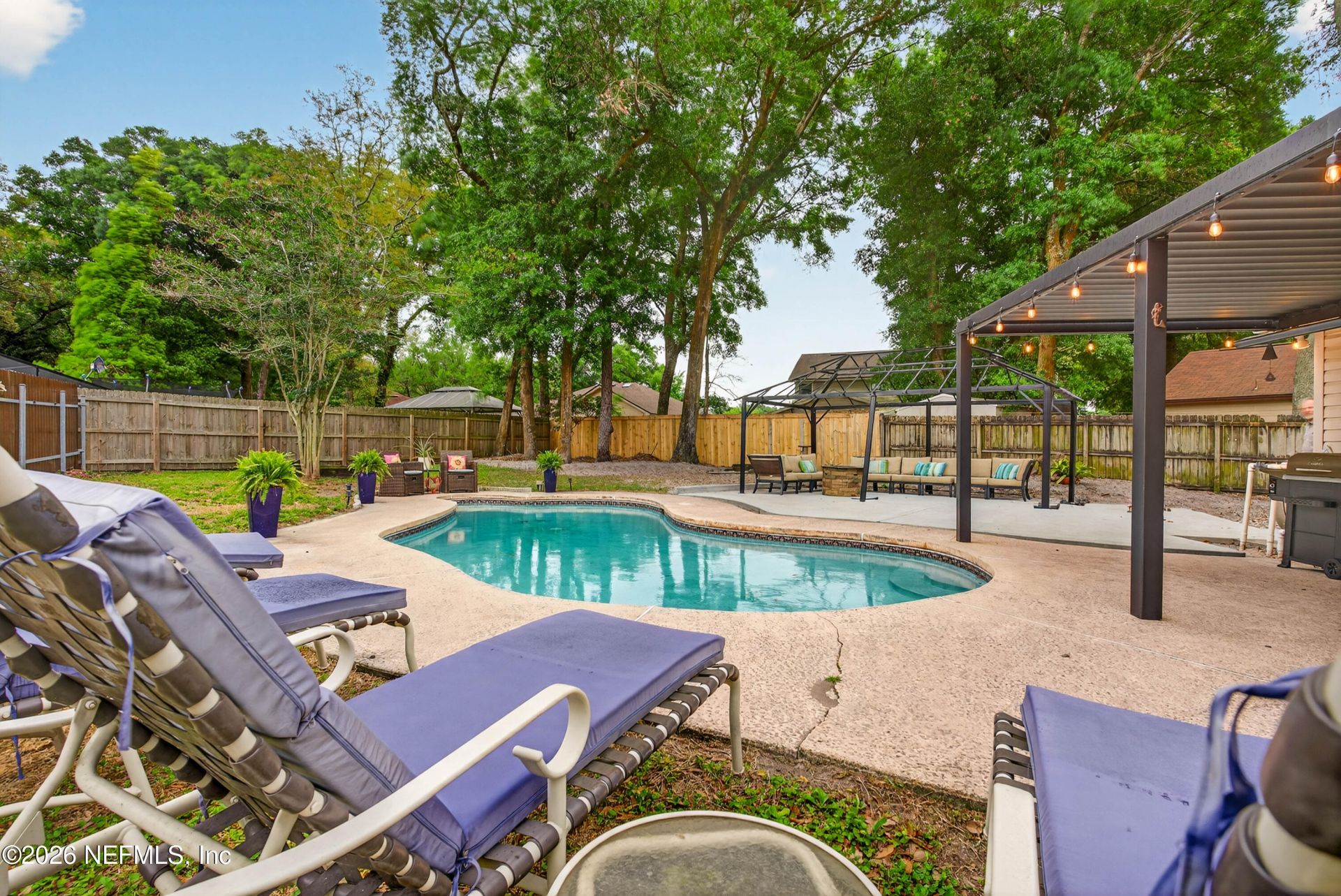Motivated seller! This 3 bedroom / 2 bathroom split floorpan home with sparkling clear in-ground POOL located close to Mayport! Large fenced-in backyard with a gazebo, fire pit and horseshoe pits. Majestic turkey oak trees provide lots of shade. Kitchen includes stainless steel appliances, pantry, and clear viewpoints to living spaces and backyard. Wood burning fireplace. High ceilings. Master en suite includes walk-in closet, garden tub / shower combo, double vanities, and water closet. Indoor laundry. Loads of closet space. Tucked away in a cul-de-sac. Close to base, shopping, restaurants and the interstate. Schedule your showing today!! Additions:20x10 Pegula (Opens/Shuts manually)Concrete pad for 20x12 Purgala10x14 Shed w/2 windows, wide door and wired for electricityadded electrical wiring to back area2024 RefrigeratorWater heater 4 years oldNew pool pump 2025