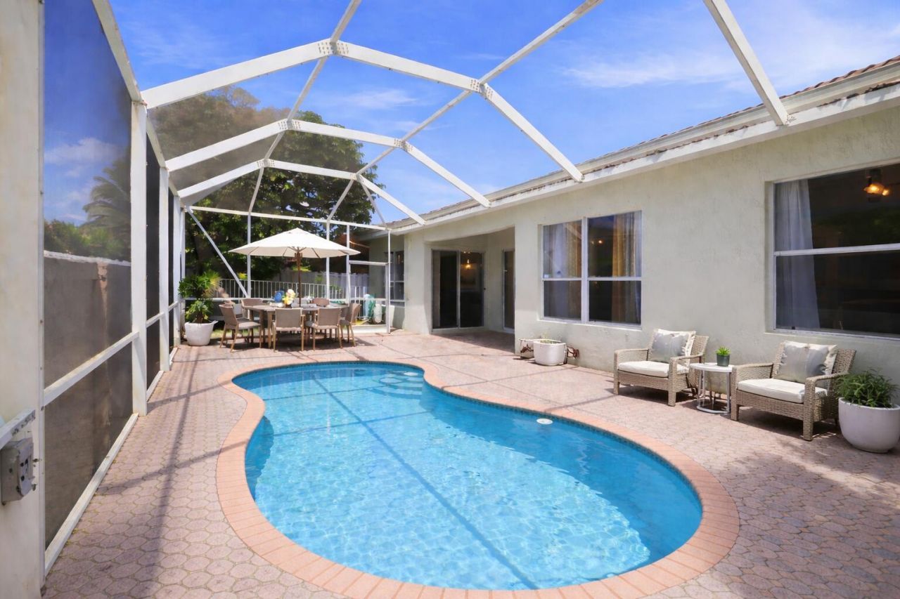 Breathtaking 5-bedroom, 3-bath, single-story pool home w/ a 3-car garage in the sought-after gated community of Windsor Palms. This beautifully maintained home offers 2,674 sq ft under air w/ a desirable split floor plan, high ceilings, porcelain tile throughout, & spacious formal living, dining, & family rooms w/ plenty of room for entertaining. Recent updates include a newer roof (2021), new A/C, & new SS appliances. The generous layout also features walk-in closets & comfortable living spaces throughout. Step outside to your own private oasis w/ a screened pool & mature mango trees, perfect for relaxing or hosting guests. Conveniently located near A-rated schools, restaurants, world-class shopping, & major highways. One or more photos are virtually enhanced.