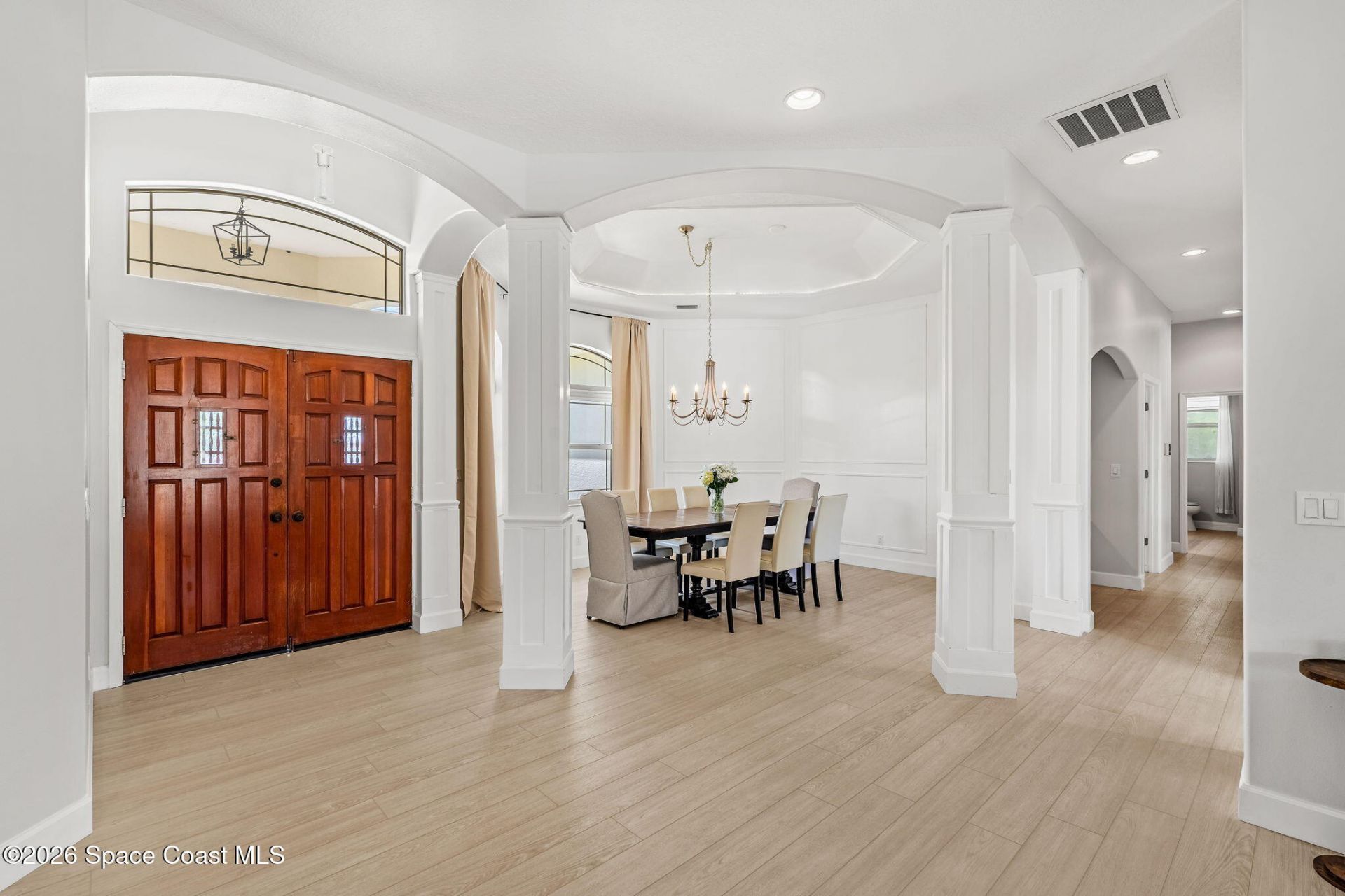 A standout Windover Farms estate delivering 5 bedrooms (or 4 + office), 4 baths & 4,163 sq ft with a rare 3-car garage, all set on over an acre of beautifully kept grounds. Inside, soaring vaulted & tray ceilings create volume & presence, while tile & LVP flooring keep the look sharp & low-maintenance. The chefs kitchen is dialed in with granite countertops, gas cooktop, electric wall oven, center island, breakfast bar & a sunlit nook overlooking the pool--equal parts function & wow factor. A central vac system adds ease, while the second-floor loft brings serious versatility with a guest suite, private theater & its own balcony. The primary suite delivers space & comfort with dual vanities, a soaking tub & walk-in shower. Out back, a gas-heated saltwater pool & spa take center stage, surrounded by lush landscaping that feels like your own private escape--all with a low HOA in one of Brevards most sought-after acreage communities.